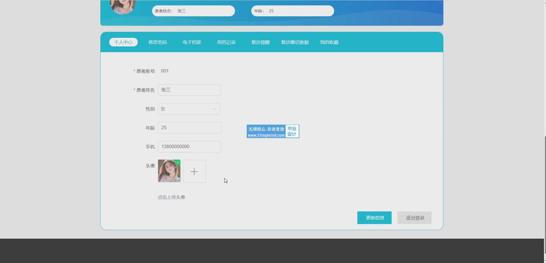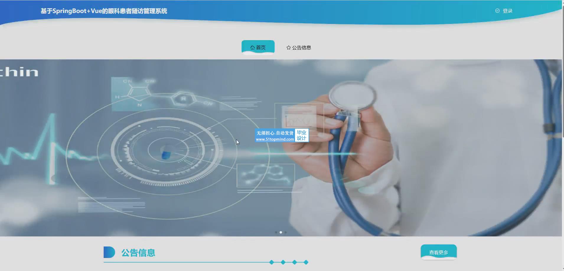 该系统由三大主体构成:管理员、患者及医生,各自扮演着不同的角色并拥有相应的权限。管理员作为系统的核心管理者,通过预设的多样化功能,能够全面掌控系统运作。利用专门的后台管理接口,对系统内的各类信息进行高效管理,确保系统的稳定运行。患者与医生则依据其特定权限,享受系统提供的不同功能服务。这种权限分级设计,不仅提升了系统的安全性和可控性,还使得各主体能够各司其职,共同促进系统的顺畅运作。该系统通过精细的权限划分,实现了对不同角色的有效管理和功能分配[9]。本文旨在设计一个既安全又便捷的系统,其核心理念围绕安全与简洁展开,目的是让患者能够更轻松地获取眼科患者随访管理的相关信息。通过这一设计,期望解决当前眼科患者随访管理信息繁杂难辨的问题,确保患者能够快速且准确地找到所需的电子档案、用药记录信息等。利用Java语言、Spring Boot框架以及MySQL数据库,开发设计了一个眼科患者随访管理系统。这一系统是基于对眼科患者随访管理业务流程的深入分析,并明确其功能性需求后构建的。该系统主要由三大部分组成:管理员端、患者和医生,以满足不同角色的使用需求。此外,该系统还能为患者提供一个便捷且实用的眼科患者随访管理系统,让患者能够迅速找到符合自身需求的物流信息。管理员通过专属界面能够高效地管理患者信息,并对系统内的所有信息进行增、删、改、查等操作。而对于患者而言,借助本系统,可以即时获取眼科的最新管理信息。