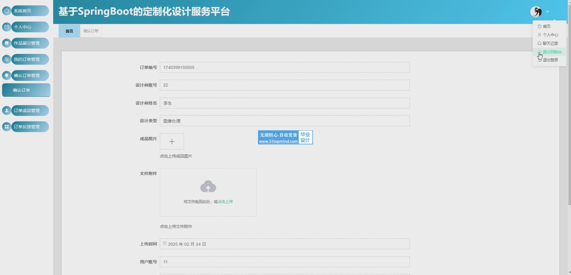 在本文中,以定制化设计服务平台作为研究对象,采用Spring Boot框架,开发了一款定制化设计服务平台应用软件。在该软件中,实现了用户、设计师、作品展示、我的订单、确认订单等功能。于是该系统将会给用户提供更多元、更个性化、更全面的服务。