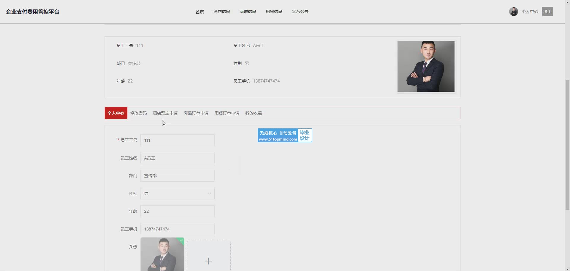 2.员工管理页面,企业管理员制定员工消费规则,包括价格,时间,地点,是否能退订,可添加,删除,修改员工,员工信息包括姓名,部门,工号