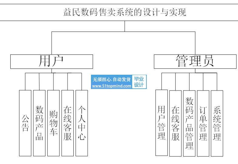 益民数码售卖系统共分为两个部分,一部分是面向用户的部分,包括:用户的注册登录,查看个人或者修改个人信息,查看公告,数码产品,购物车,在线客服,个人中心等功能。另一部分是系统的后台管理部分,包括对用户账号的新增、删除、修改等操作,以及查看个人信息,进行系统管理,在线客服,数码产品管理,订单管理等功能。