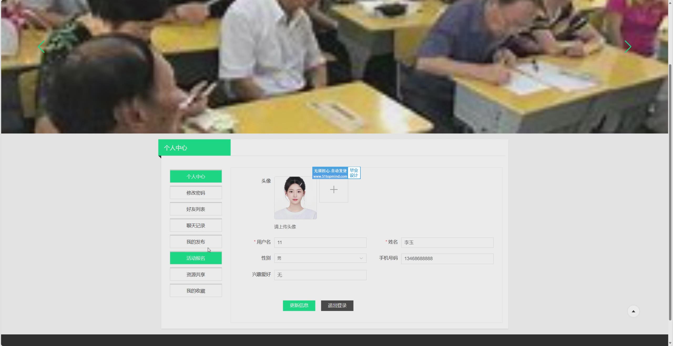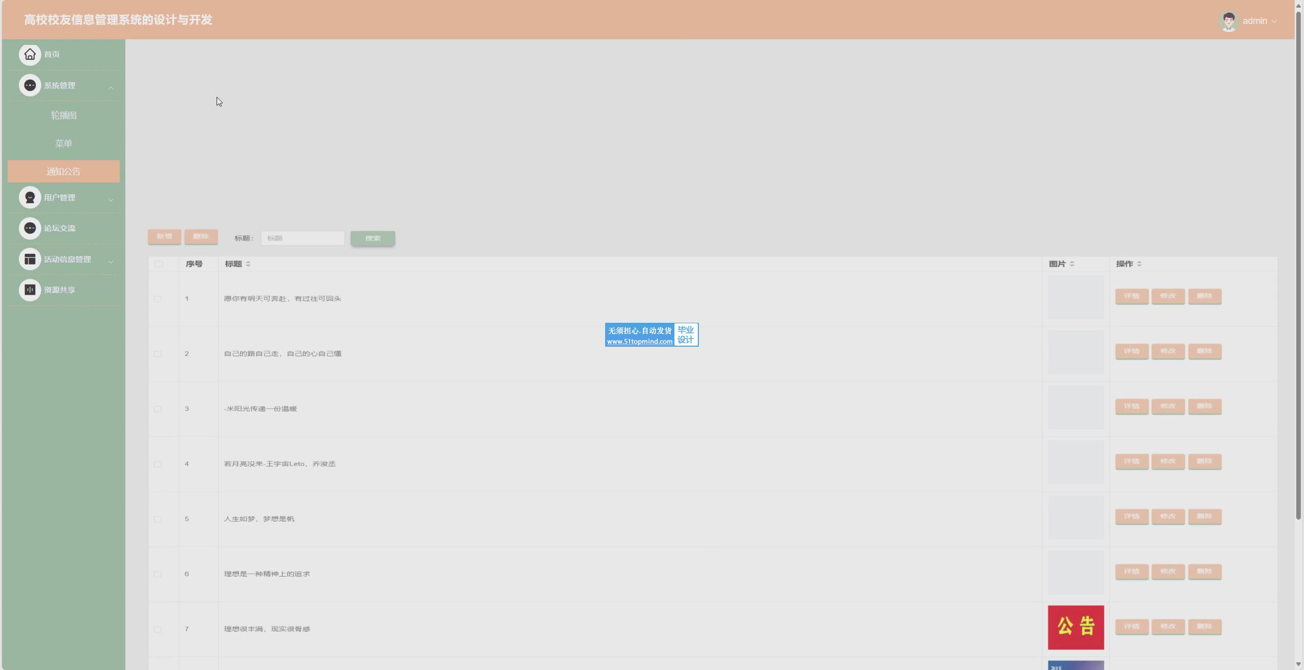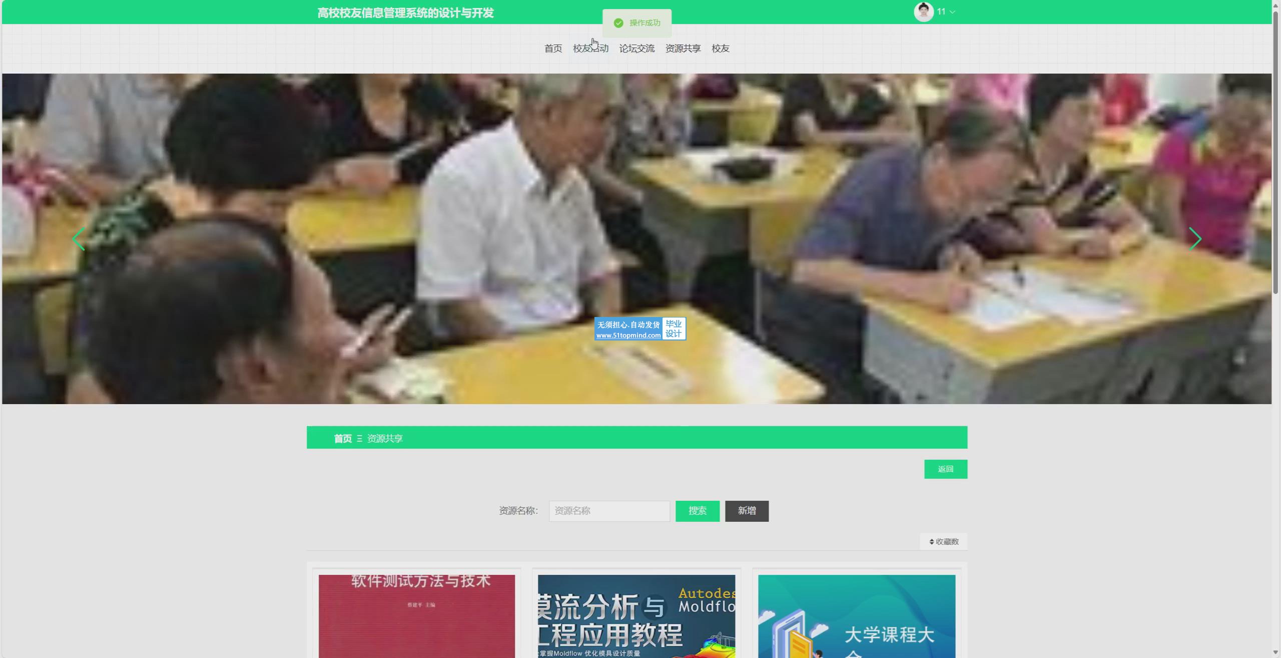 随着信息技术快速发展,高校校友信息管理需求日益增长。传统校友管理依赖人工记录和纸质文档,信息更新不及时、查询效率低、资源分散且难以整合。为解决这些问题,本系统采用Vue构建前端界面,SpringBoot作为后端框架,MySQL作为数据库。系统功能包括校友活动信息浏览、报名、发表帖子评论、资源共享信息浏览、查看校友信息;管理员可进行用户管理、论坛交流管理、活动信息管理、资源共享管理。