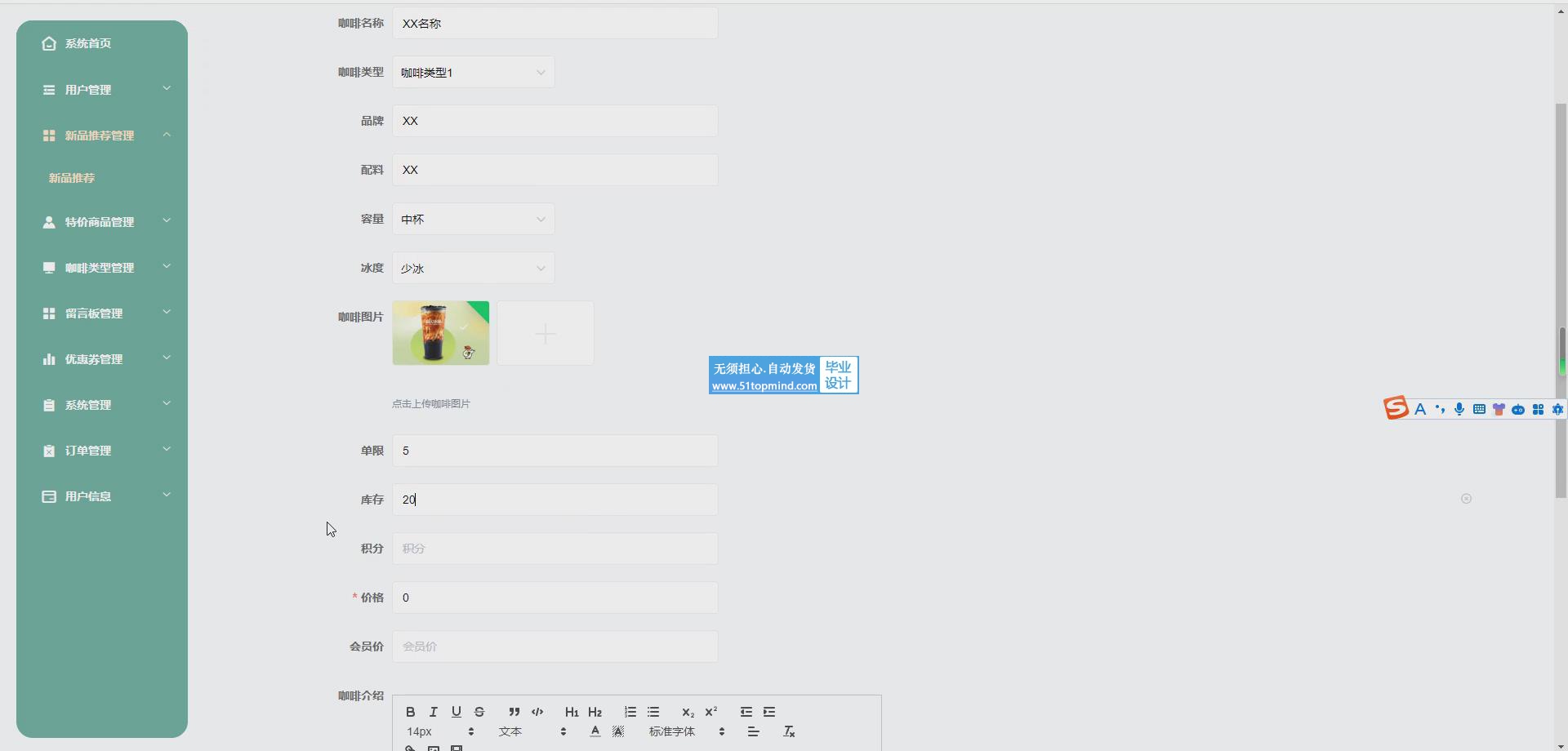 商品管理主要为商家提供对商品的上架,下架,标价,商品数量,商品类别,是否可以使用优惠卷,更改商品可以供用户选择的信息,如去冰/不去冰等功能。