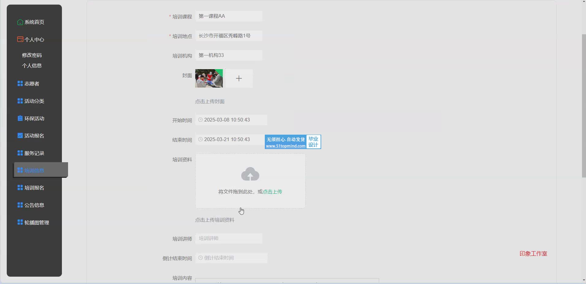 基于Java的环保志愿者管理系统采用Vue与SpringBoot技术构建,MySQL数据库存储数据。用户端支持活动报名、培训申请、公告浏览与服务记录查询;管理员端实现志愿者管理、活动发布审核、报名核验、培训数据统计与轮播图配置。系统通过数字化流程提升信息同步效率,优化资源分配,推动环保志愿服务向规范化与精细化转型。