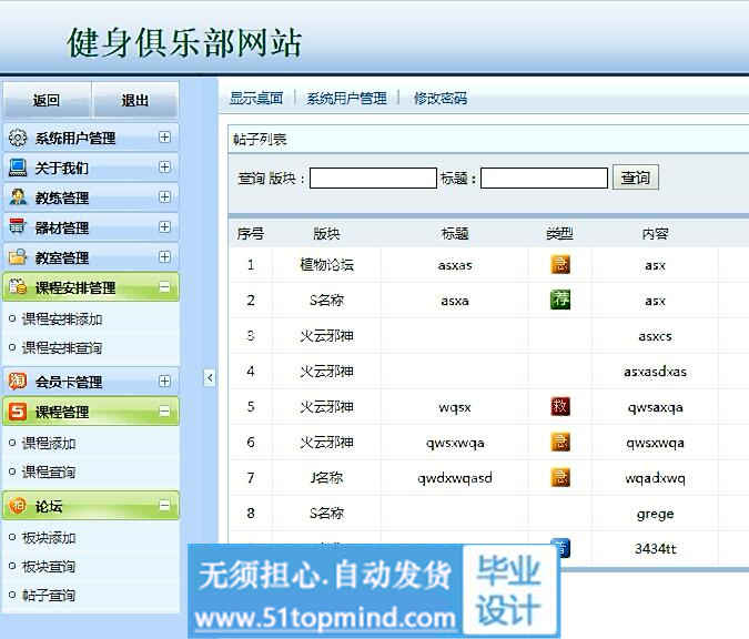 健身俱乐部采用目前最流行的SSM 框架和 Eclipse 编辑器、MySQL 数据库设计并实现的。本健身俱乐部网站系统主要包括系统用户管理、新闻数据管理、用户管理、教练管理、器材管理、教室管理、课程安排管理、选课管理、课程管理、会员卡管理、办卡管理等多个模块.