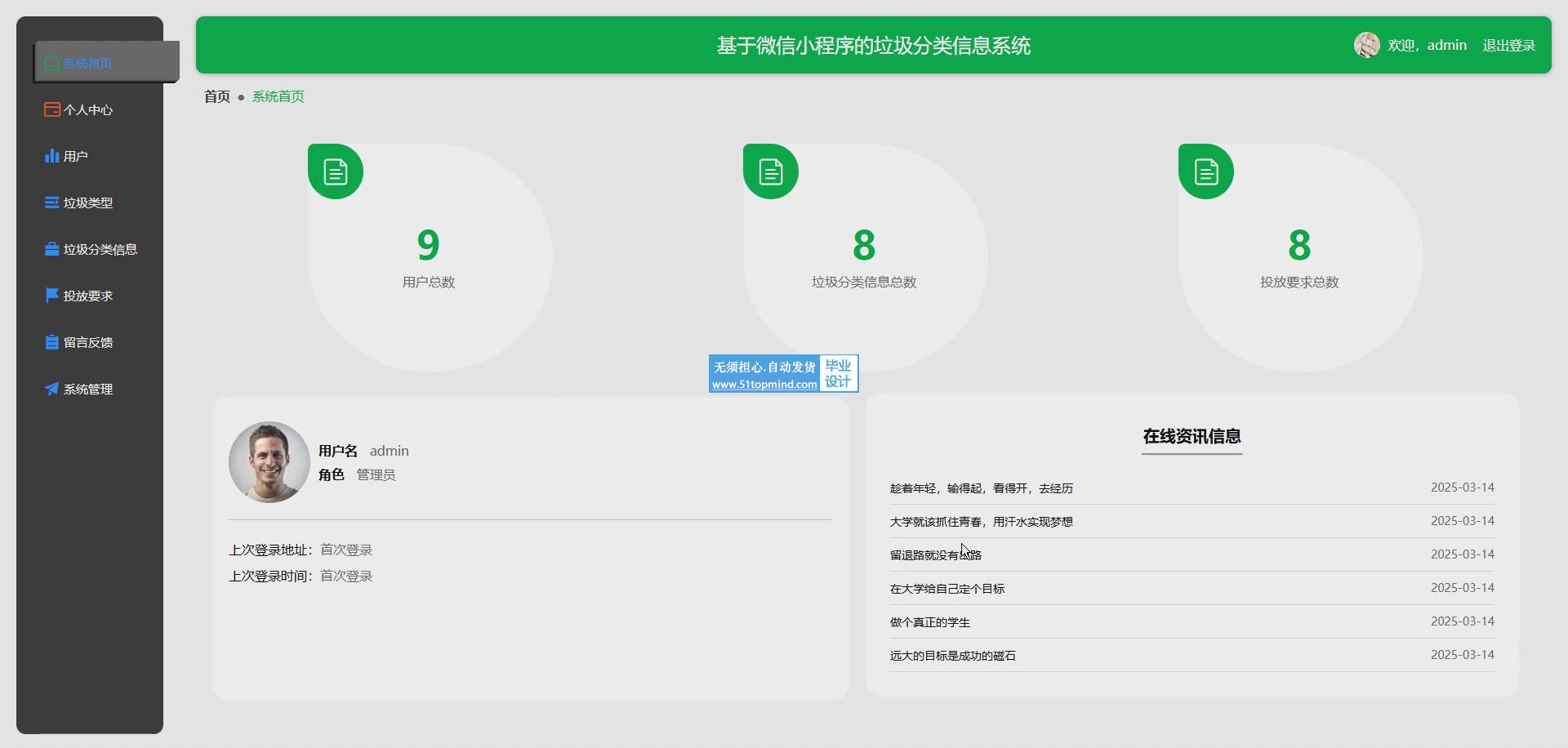 垃圾分类信息系统主要是为了提高管理员的工作效率,满足管理员对更方便、更快、更好地存储所有信息和数据检索功能的要求。通过对多个类似网站的合理分析,确定了垃圾分类信息系统的各个模块。考虑到用户的可操作性,经过深入调查研究,遵循系统优化和开发的原则[8]。