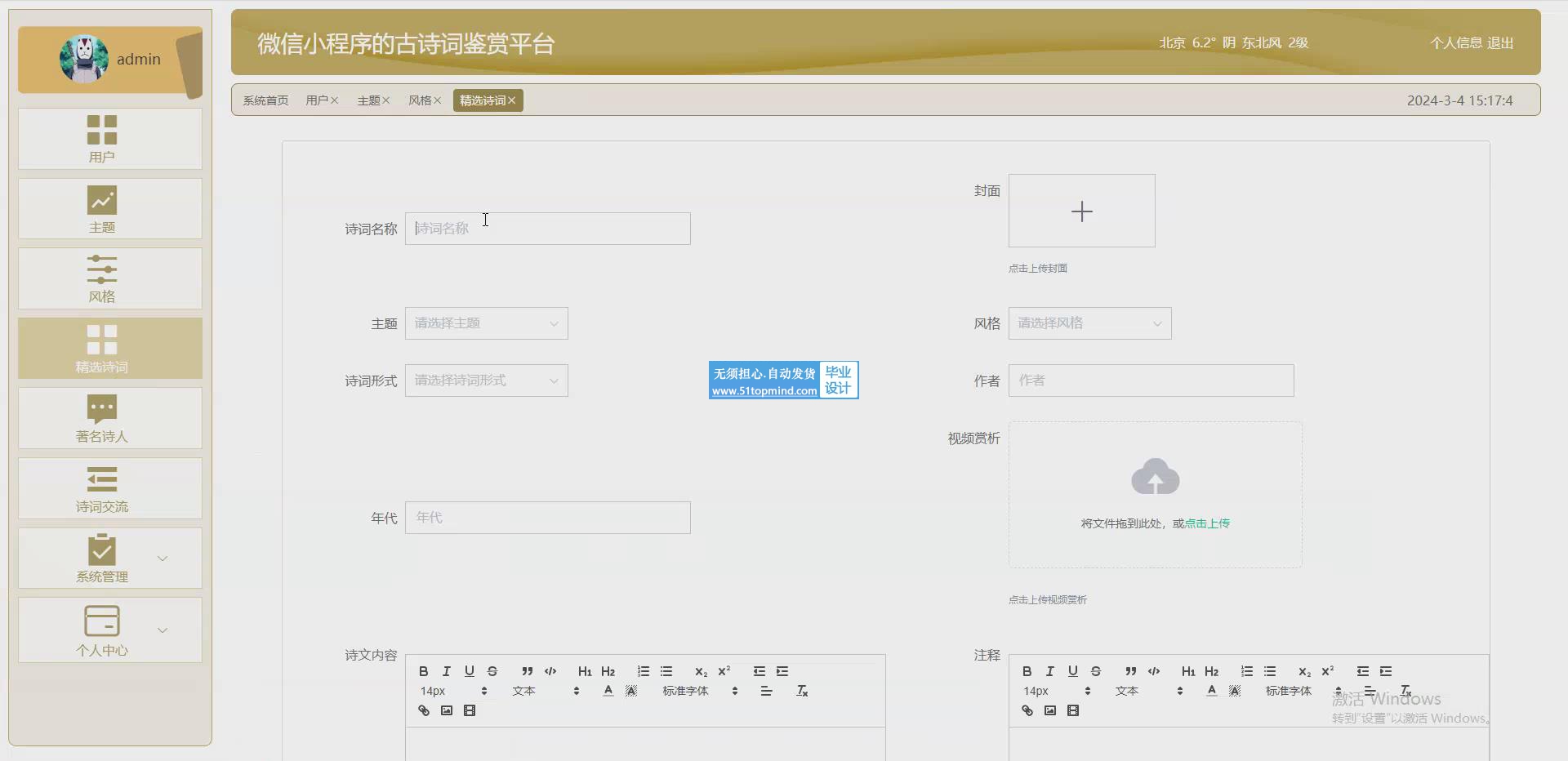 本课题旨在开发一个功能完善、用户友好的古诗词鉴赏微信小程序,以满足用户对古诗词学习和欣赏的需求。通过该小程序,用户可以方便地浏览、搜索和阅读古诗词作品,了解诗词的背景和作者的生平,欣赏名句和标注信息,同时还能够深入了解相关的朝代信息和古籍简介。通过这些功能的整合和优化,旨在提升用户对古诗词的兴趣和理解,促进中华文化的传承和发展。