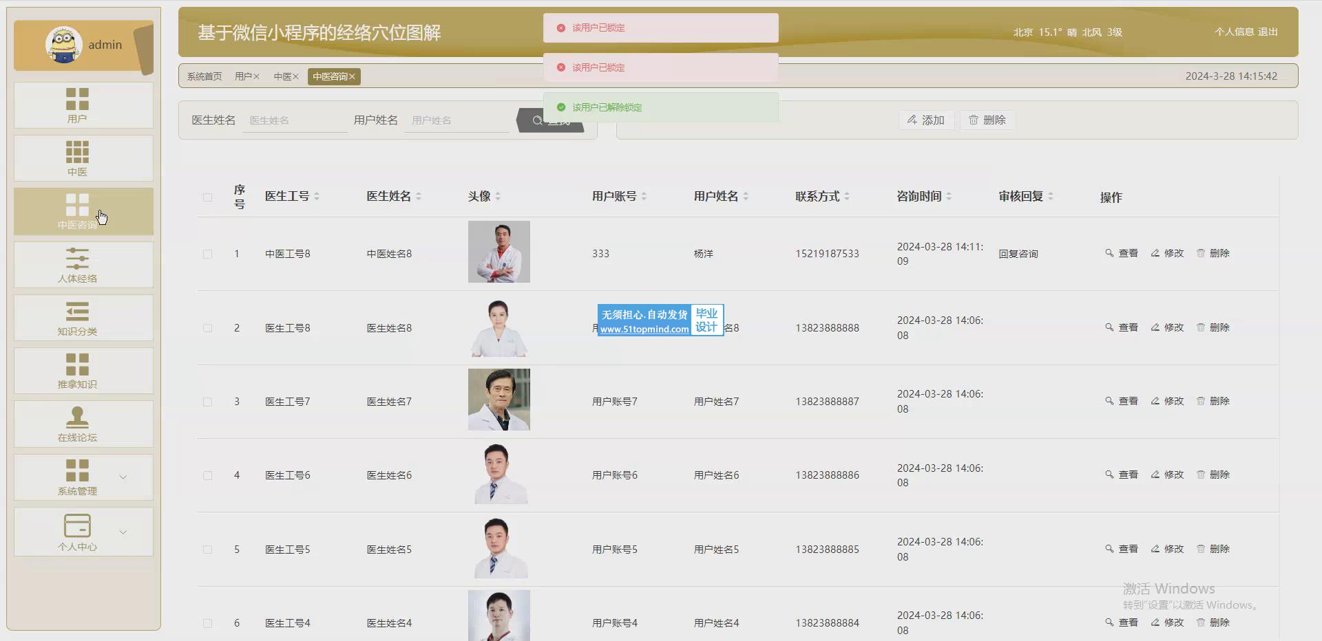 (2)用户管理:管理不同权限下的用户信息,执行添加和修改以及对中医注册申请的审核操作。
