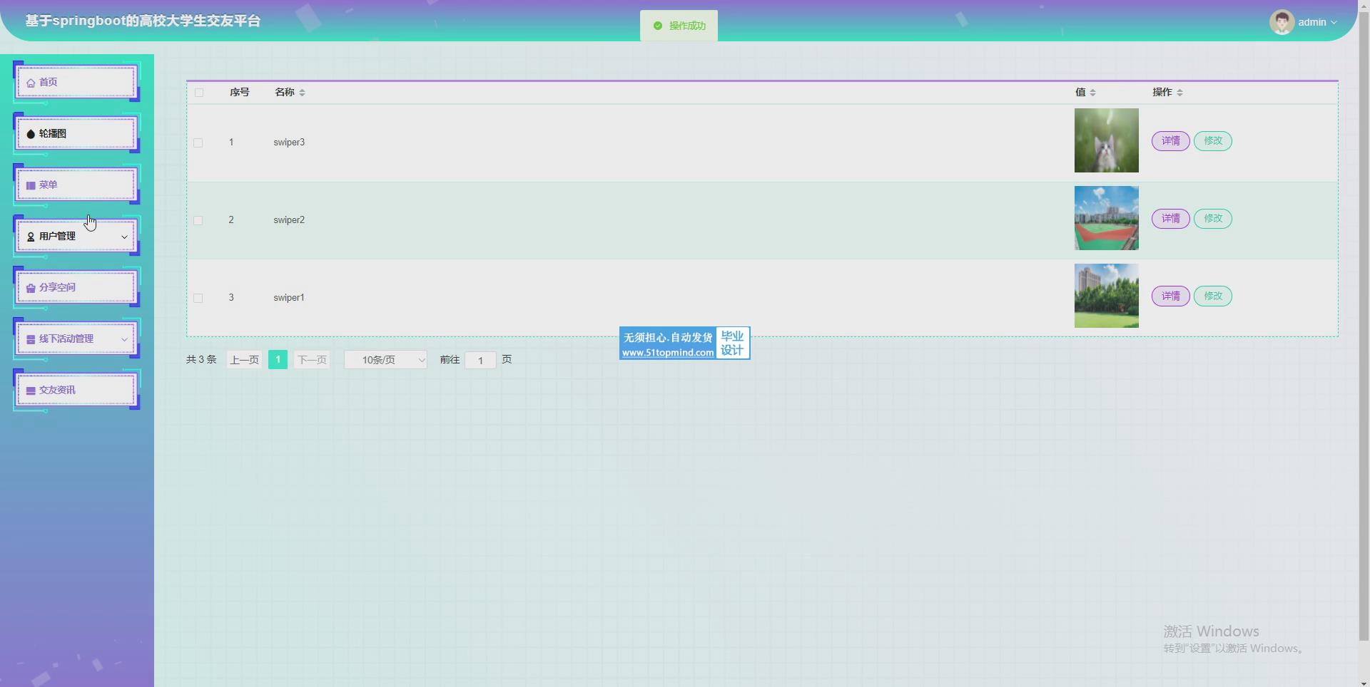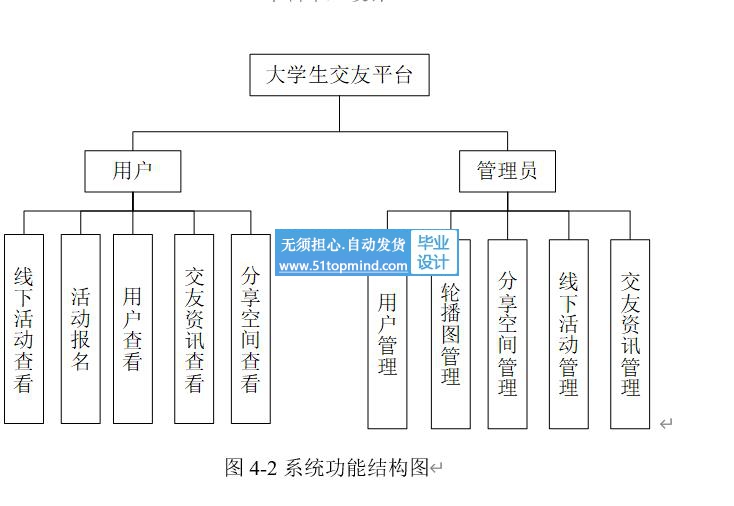 平台功能分为用户和管理员两部分。用户可查看线下活动并报名,浏览其他用户信息,查看交友资讯,以及查看分享空间动态。管理员负责轮播图管理、用户管理、分享空间管理、线下活动管理和交友资讯管理。通过技术优化和功能设计,平台提升交友效率,拓展社交范围,满足大学生交友需求。