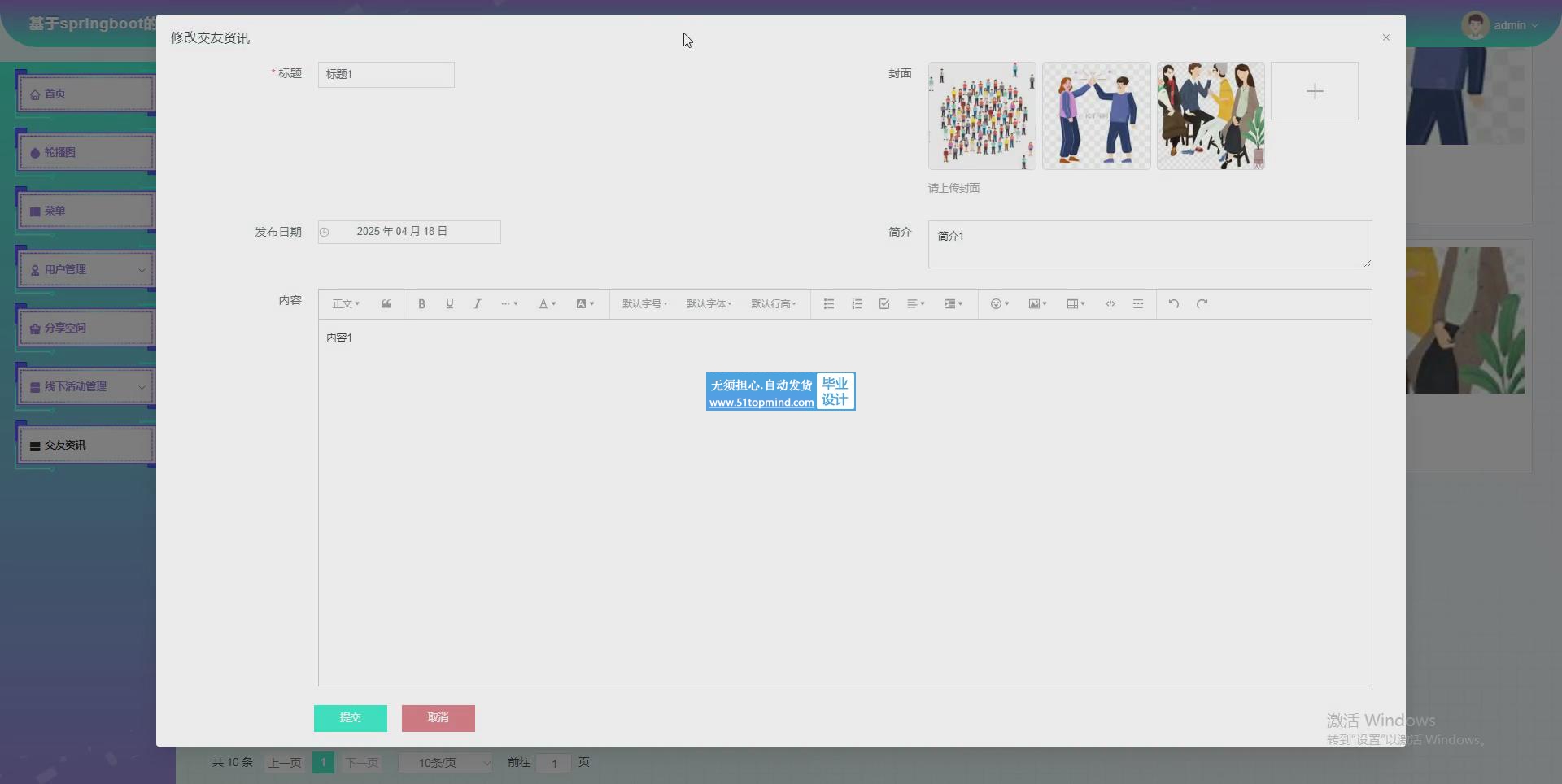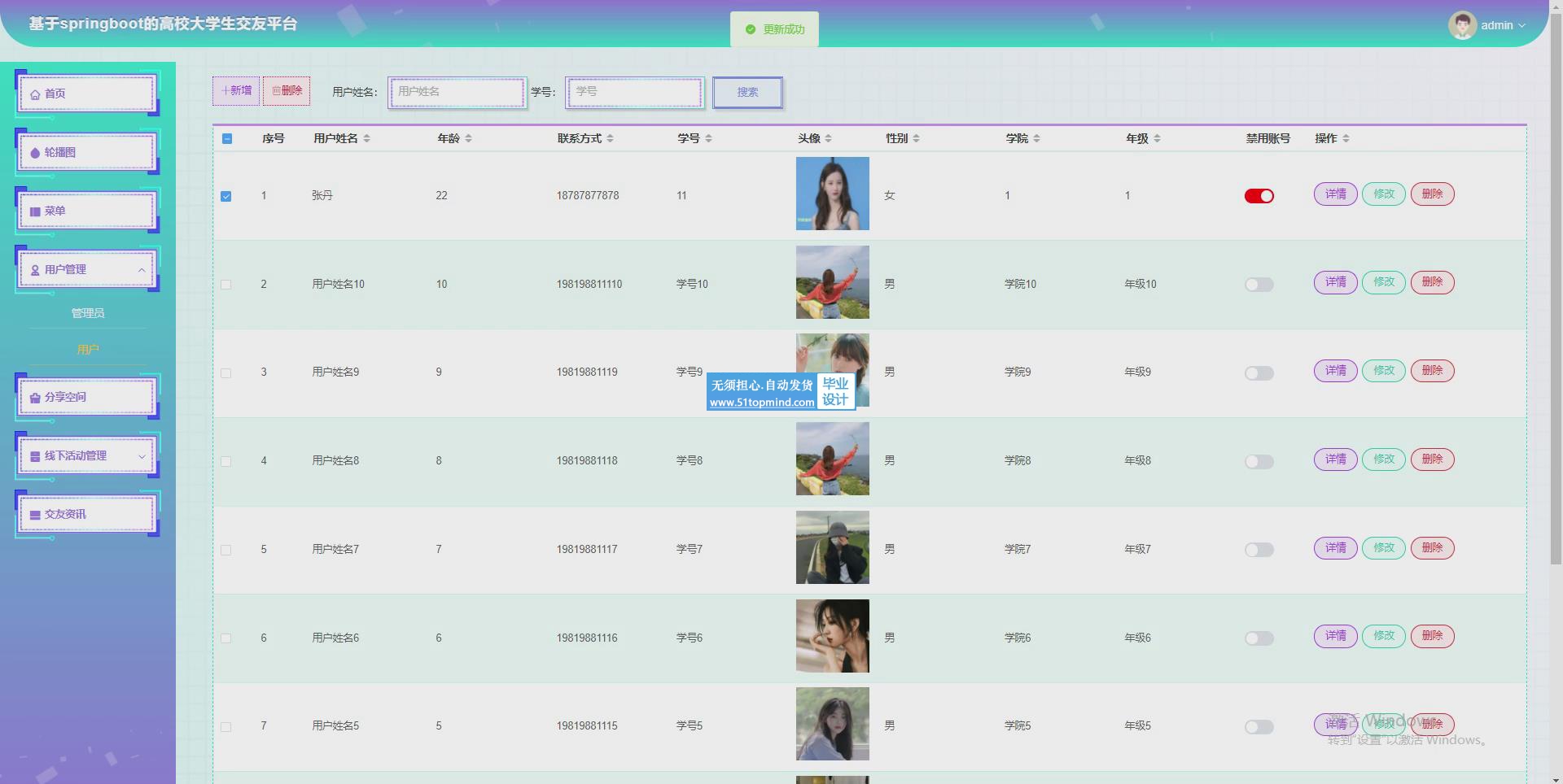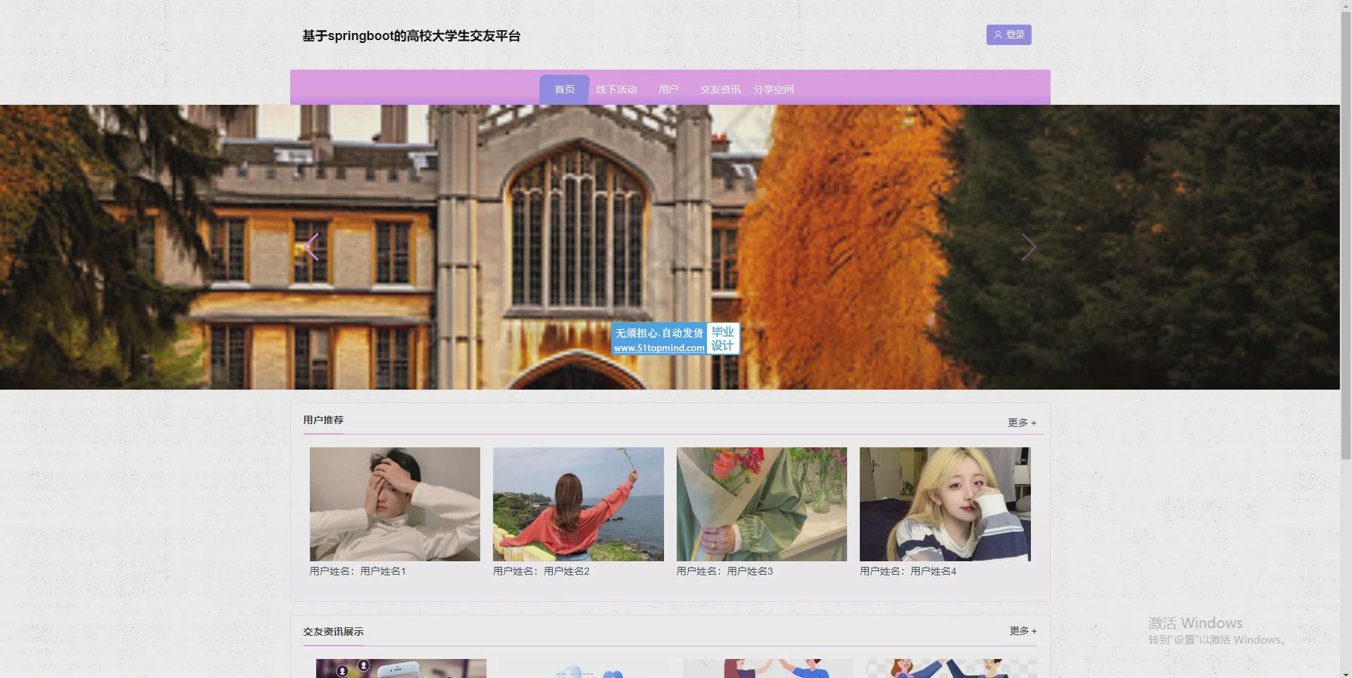随着互联网技术发展,大学生交友模式逐渐从线下向线上转移。以往交友活动主要依靠校园社团组织或班级聚会,形式单一,信息传播范围有限,难以满足大学生多元交友需求。信息更新滞后,难以实时获取交友资讯,且缺乏个性化推荐功能,导致交友效率低,社交圈子难以拓展。为解决这些问题,开发高校大学生交友平台,前端采用 Vue 技术,后端基于 SpringBoot 框架,数据库选用 MySQL。