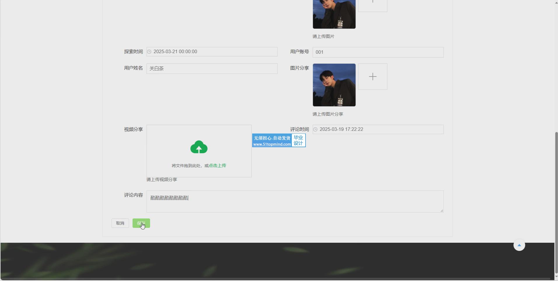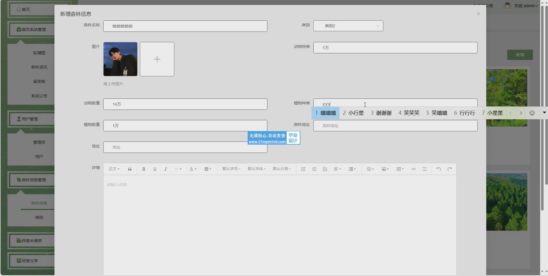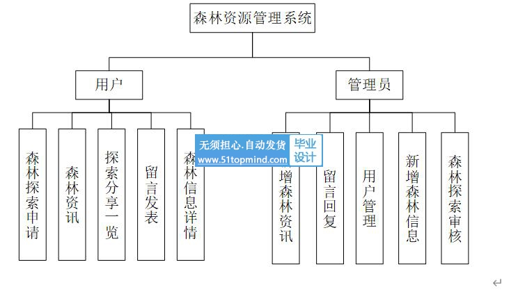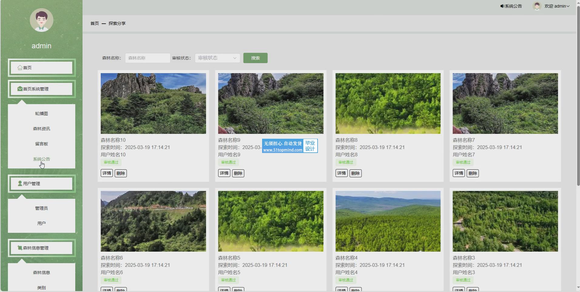 本系统为森林资源管理提供全面功能支持,用户可查询森林信息详情、提交森林探索申请、浏览森林资讯、查看探索分享及发表留言。管理员则具备新增森林资讯、回复留言、管理用户、新增森林信息以及审核森林探索申请等权限。系统通过角色划分实现功能差异化,满足用户与管理员的多样化需求,提升森林资源管理的效率与科学性,促进森林资源的合理利用与保护。